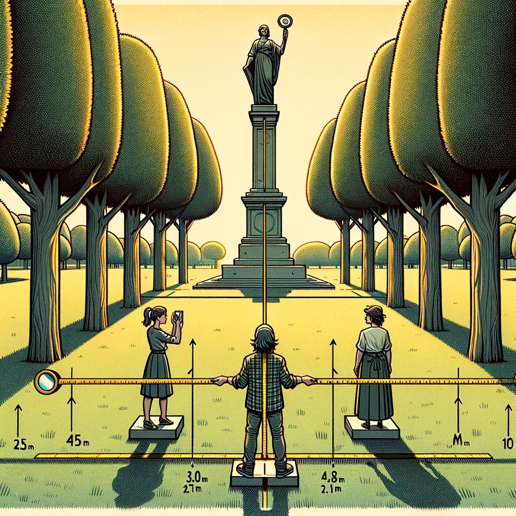 Dans un parc, Lisa et Max observent deux arbres alignés avec une statue. Ils se placent sur la ligne imaginée entre les arbres et la statue pour mesurer certaines distances afin de déterminer la hauteur des arbres sans avoir à grimper. Lisa se positionne à la base du premier arbre, et Max marche jusqu’à la statue en mesurant la distance parcourue. Ils utilisent un mètre ruban pour les mesures au sol et un miroir pour s’assurer de l’alignement visuel avec les sommets des arbres.