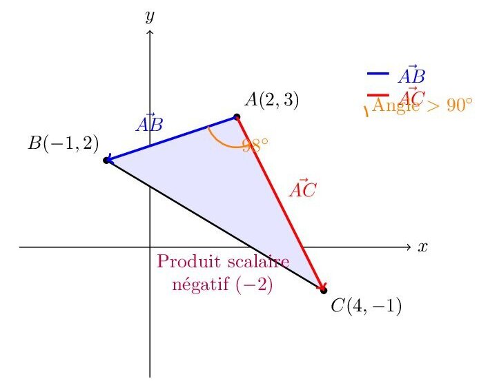 Ici, le produit scalaire \(\vec{AB} \cdot \vec{AC}\) est négatif (-2), ce qui implique que l’angle entre \(\vec{AB}\) et \(\vec{AC}\) est supérieur à \(90^\circ\) (puisque \(\cos \theta < 0\). En particulier, l’angle en A, formé par les vecteurs \(\vec{AB}\) et \(\vec{AC}\), est d’environ \(98^\circ\), c’est-à-dire obtus.